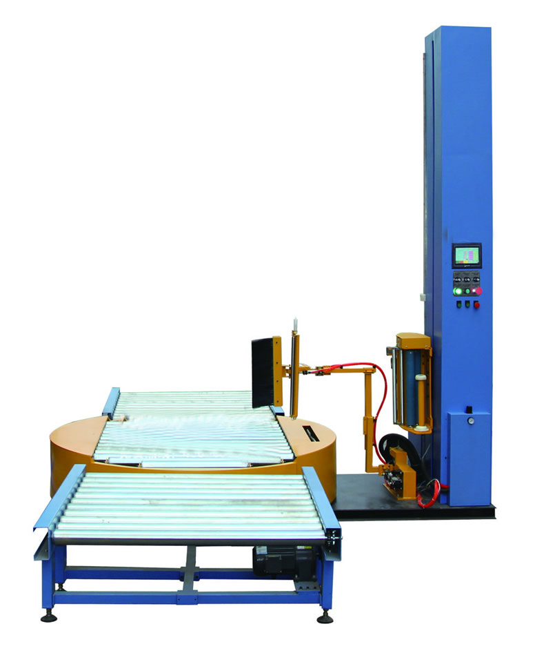 2 將待包裝物體通過輥道輸送至本設備平行托起運送至轉盤中心位置,打開啟動按鈕,機器自動按設定程序包裝物體,完成后自動停止。